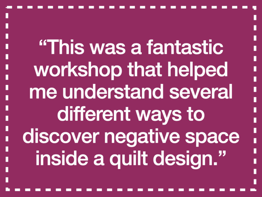 The term “negative space” often conjures ideas of a vast expanse of solid fabric, but using a variety of fabrics in the negative space can add a great deal of additional interest to negative space. In this lecture we will explore the possibilities of a more scrappy approach to negative space. What sorts of fabrics and prints work best in the negative space? And what sort of piecing techniques can you use to make the negative space flow well with your foreground? These design strategies will be particularly helpful to anyone looking to use more of what they already have!